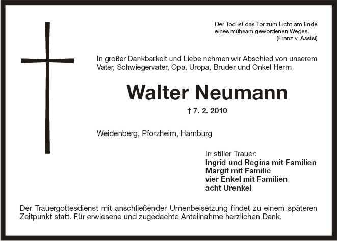 Die Urnenbeisetzung findet am Samstag, den 22.5.2010 um 15.00 Uhr auf dem Friedhof in Weidernberg statt.