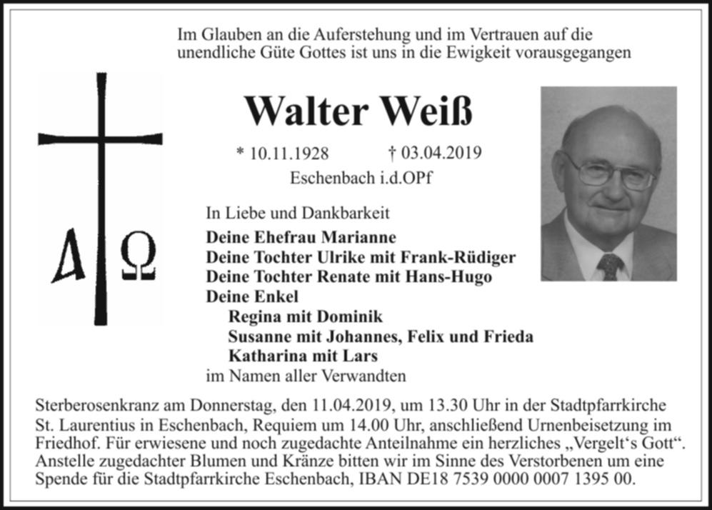 Sterberosenkranz am Donnerstag, den 03.04.2019, um 13.30 Uhr in der Pfarrkirche St. Laurentius Eschenbach, Requiem um 14.00 Uhr, anschließend Urnenbeisetzung im Friedhof. Für alle Anteilnahme ein herzliches "Vergelt's Gott".