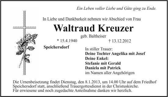Die Urnenbeisetzung findet Dienstag, den 8.1.2013, um 14.00 Uhr auf dem Friedhof Speichersdorf statt, anschließend Trauergottesdienst in der Christuskirche.
