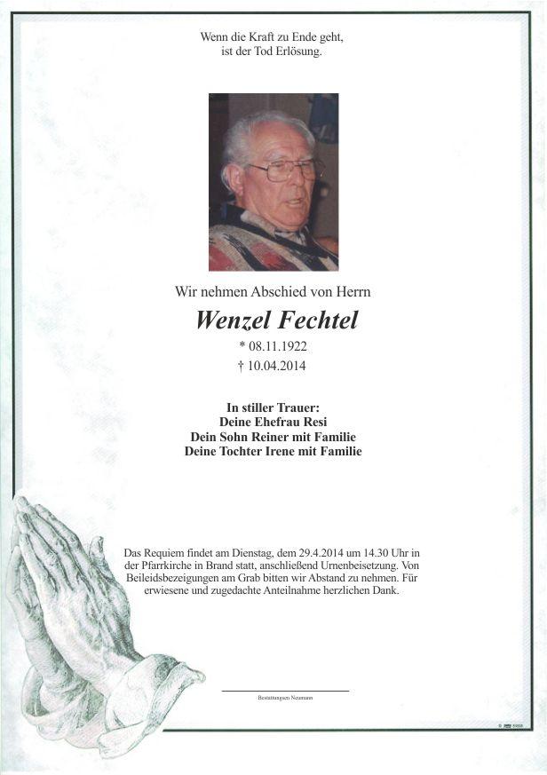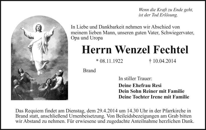 Das Requiem findet am Dienstag, dem 29.4.2014 um 14.30 Uhr in der Pfarrkirche in Brand statt, anschließend Urnenbeisetzung. Von Beileidsbezeigungen am Grab bitten wir Abstand zu nehmen. Für erwiesene und zugedachte Anteilnahme herzlichen Dank.