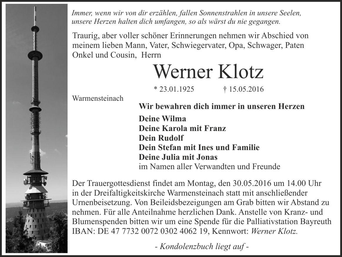 Der Trauergottesdienst findet am Montag, den 30.05.2016, um 14.00 Uhr in der Dreifaltigkeitskirche in Warmensteinach statt mit anschließender Urnenbeisetzung. Von Beileidsbezeigungen am Grab bitten wir Abstand zu nehmen. Für alle Anteilnahme herzlichen Dank. - Kondolenzbuch liegt auf -
