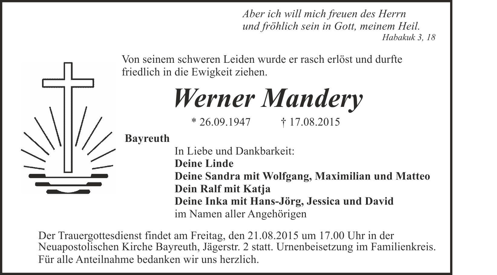 Der Trauergottesdienst findet am Freitag, den 21.08.2015 um 17.00 Uhr in der Neuapostolischen Kirche Bayreuth, Jägerstr. 2 statt. Urnenbeisetzung im Familienkreis. Für alle Anteilnahme herzlichen Dank.