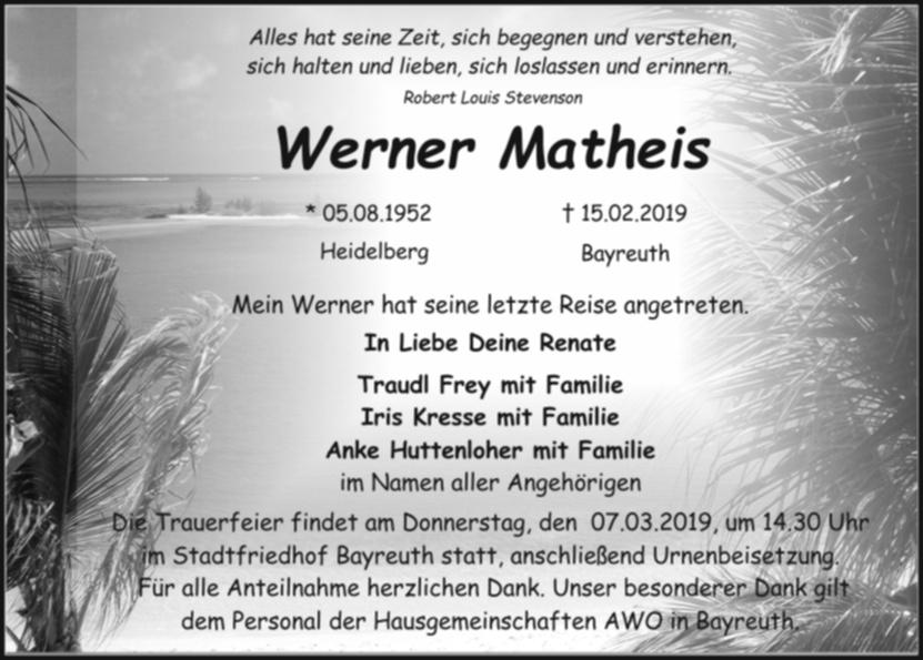 Die Trauerfeier findet am Donnerstag, den 07.03.2019, um 14.30 Uhr im Stadtfriedhof Bayreuth statt, anschließend Urnenbeisetzung. Für alle Anteilnahme herzlichen Dank.