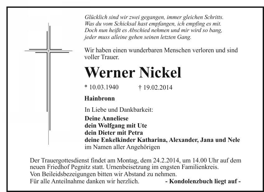 Der Trauergottesdienst findet am Montag, dem 24.2.2014, um 14.00 Uhr auf dem neuen Friedhof Pegnitz statt. Urnenbeisetzung im engsten Familienkreis.