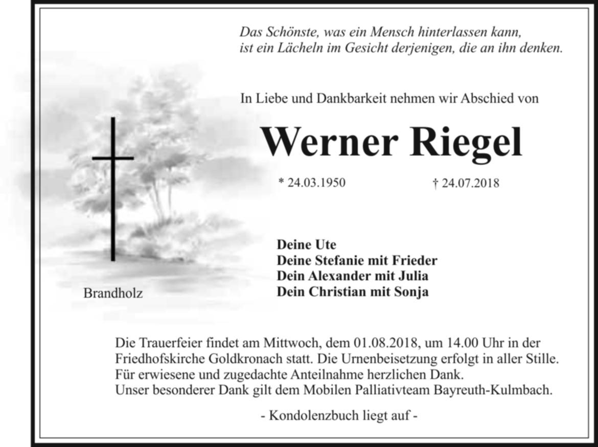 Die Trauerfeier findet am Mittwoch, dem 01.08.2018, um 14.00 Uhr in der Friedhofskirche Goldkronach statt. Die Urnenbeisetzung erfolgt in aller Stille.