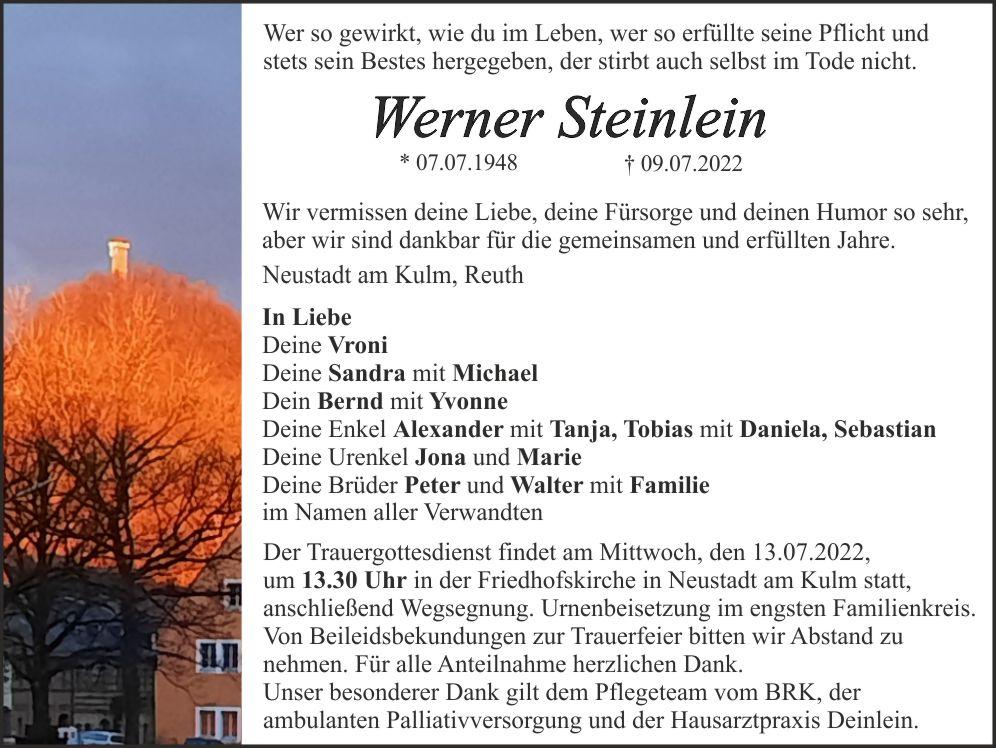 um 13.30 Uhr in der Friedhofskirche in Neustadt am Kulm statt, anschließend Wegsegnung. Urnenbeisetzung im engsten Familienkreis.