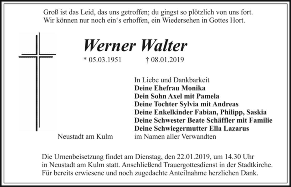 Die Urnenbeisetzung findet am Dienstag, dem 22.01.2019, um 14.30 Uhr im Friedhof Neustadt am Kulm statt, anschließend Trauergottesdienst.