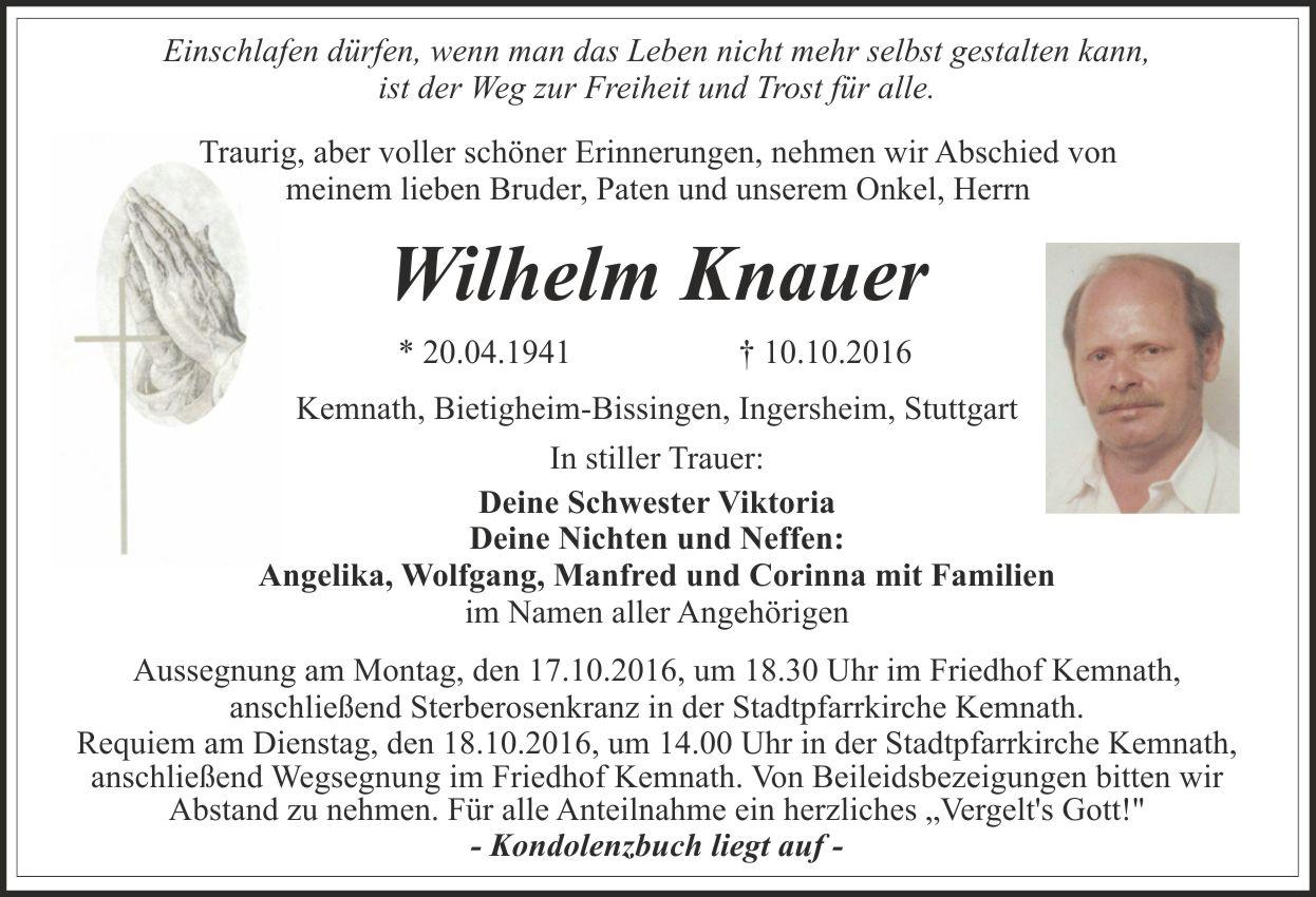 Aussegnung am Montag, den 17.10.2016, um 18.30 Uhr im Friedhof Kemnath, anschließend Sterberosenkranz in der Stadtpfarrkirche. Requiem am Dienstag, den 18.10.2016, um 14.00 Uhr in der Stadtpfarrkirche Kemnath, anschließend Wegsegnung im Friedhof Kemnath.