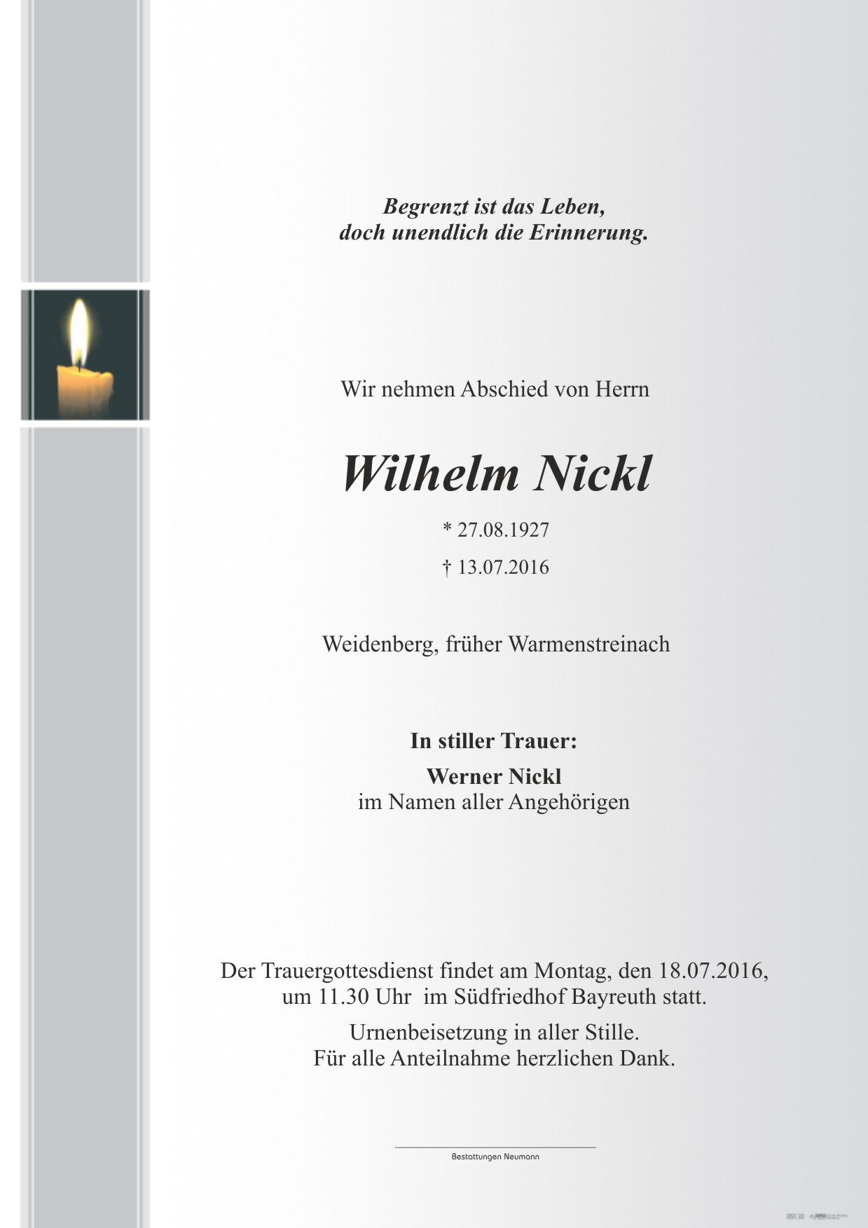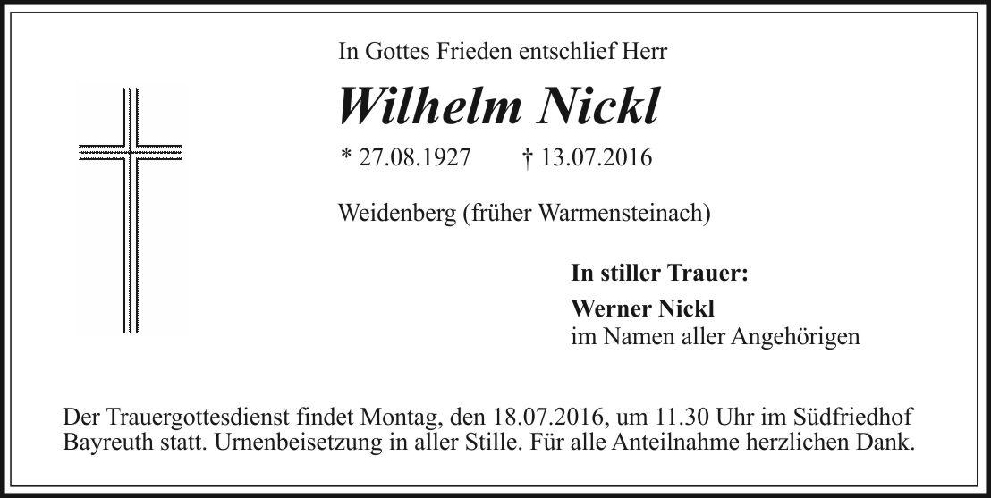Der Trauergottesdienst findet Montag, den 18.07.2016, um 11.30 Uhr im Südfriedhof Bayreuth statt. Urnenbeisetzung in aller Stille. Für alle Anteilnahme herzlichen Dank.