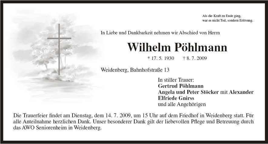 Die Trauerfeier mit anschließender Verabschiedung findet am Dienstag, 14.7.2009 um 15.00 Uhr in Stephanskirche Weidenberg statt.
