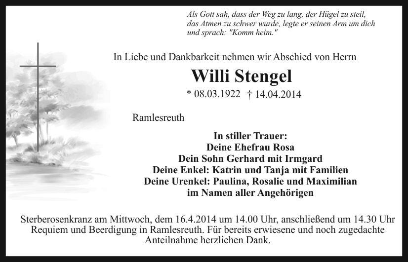 Sterberosenkranz am Mittwoch, dem 16.4.2014 um 14.00 Uhr, anschließend um 14.30 Uhr Requiem und Beerdigung in Ramlesreuth. Für bereits erwiesene und noch zugedachte Anteilnahme herzlichen Dank.