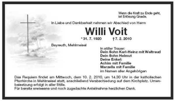 Aussegnung am Montag, den 8.2.2010 um 18.00 Uhr auf dem Friedhof in Mehlmeisel, anschließend Sterberosenkranz. Das Requiem findet am Mittwoch, den 10.2.2010 um 14.30 Uhr in der katholischen Pfarrkirche in Mehlmeisel statt, anschließend Wegsegnung.