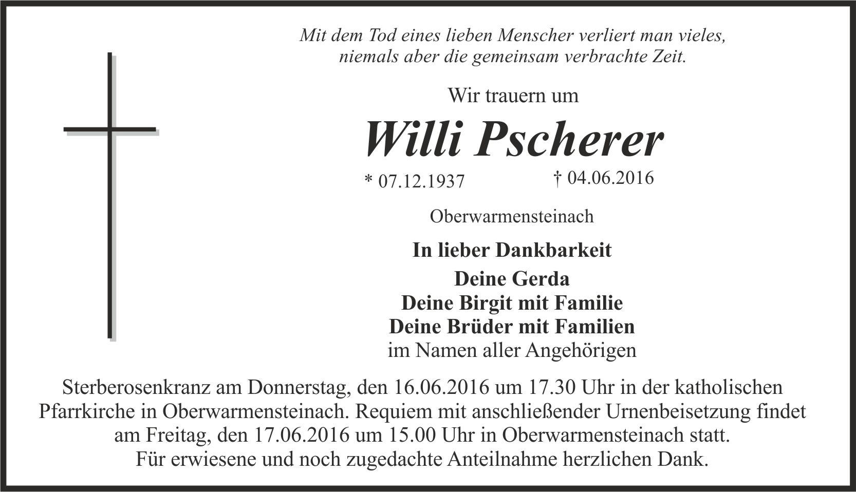 Sterberosenkranz am Donnerstag, den 16.06.2016, um 17.30 Uhr in der katholischen Pfarrkirche Oberwarmensteinach. Requiem mit anschließender Urnenbeisetzung findet am Freitag, den 17.06.2016, um 15.00 Uhr in der katholischen Pfarrkirche Oberwarmensteinach statt. Für alle Anteilnahme herzlichen Dank.