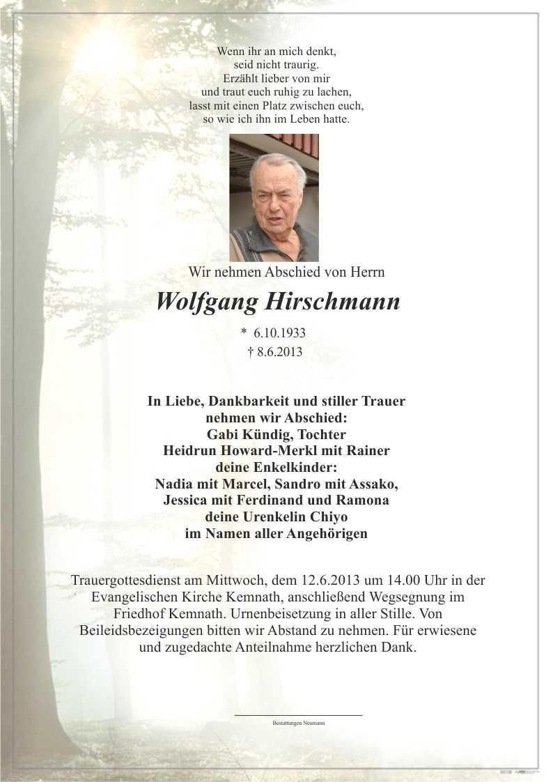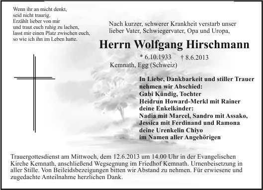 Trauergottesdienst am Mittwoch, dem 12.6.2013 um 14.00 Uhr in der Evangelischen Kirche Kemnath, anschließend Wegsegnung im Friedhof Kemnath. Urnenbeisetzung in aller Stille. Von Beileidsbezeigungen bitten wir Abstand zu nehmen. Für erwiesene und zugedachte Anteilnahme herzlichen Dank.