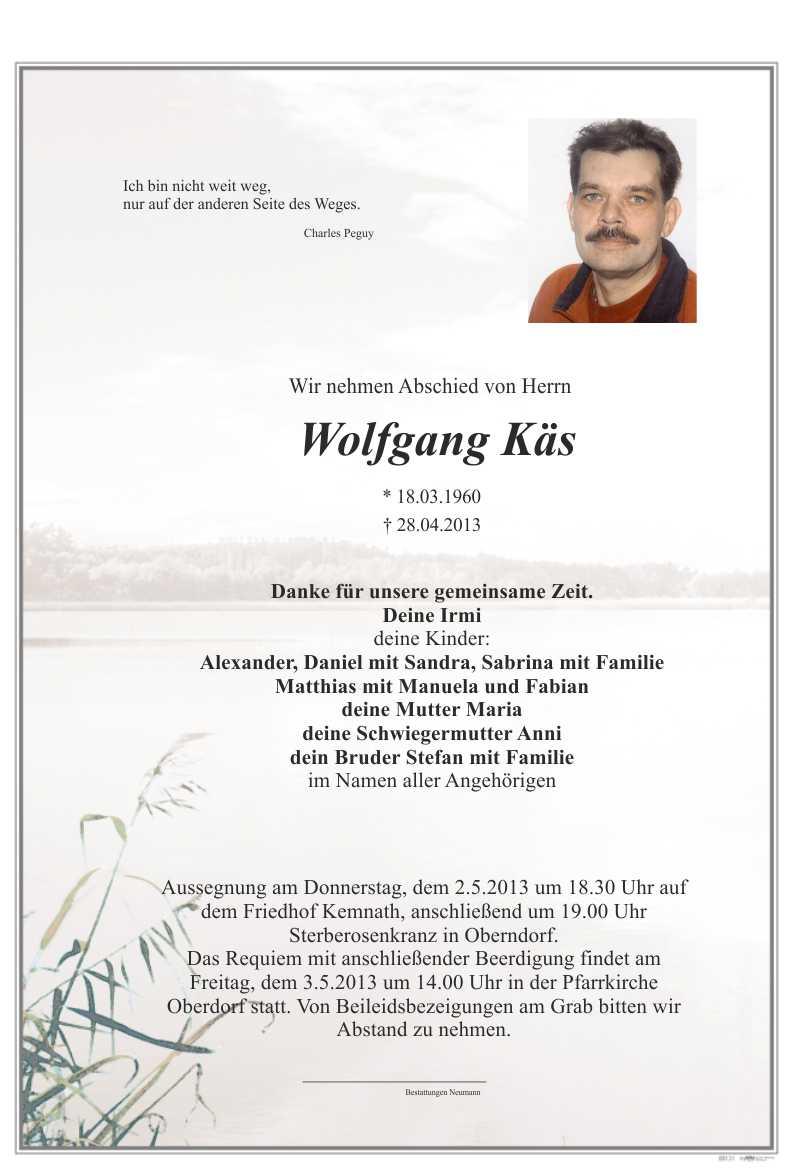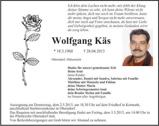 Das Requiem mit anschließender Beerdigung findet am Freitag, dem 3.5.2013 um 14.00 Uhr in der Pfarrkirche Oberdorf statt. Von Beileidsbezeigungen am Grab bitten wir Abstand zu nehmen.