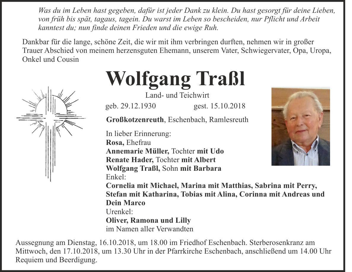 Aussegnung am Dienstag, den 16.10.2018, um 18.00 Uhr im Friedhof Eschenbach. Sterberosenkranz am Mittwoch, den 17.10.2018, um 13.30 Uhr in der Pfarrkirche Eschenbach, um 14.00 Uhr Requiem, anschließend Beerdigung.